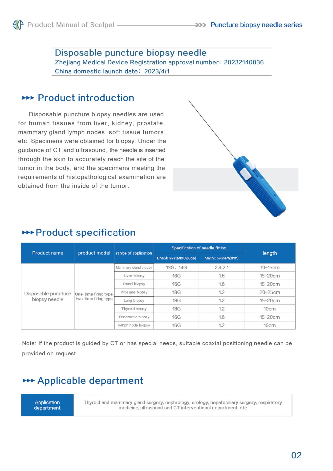 Suitable for percutaneous puncture to obtain specimens from human tissues such as the liver, kidney, prostate, breast, lymph nodes, and soft - tissue tumors for biopsy.